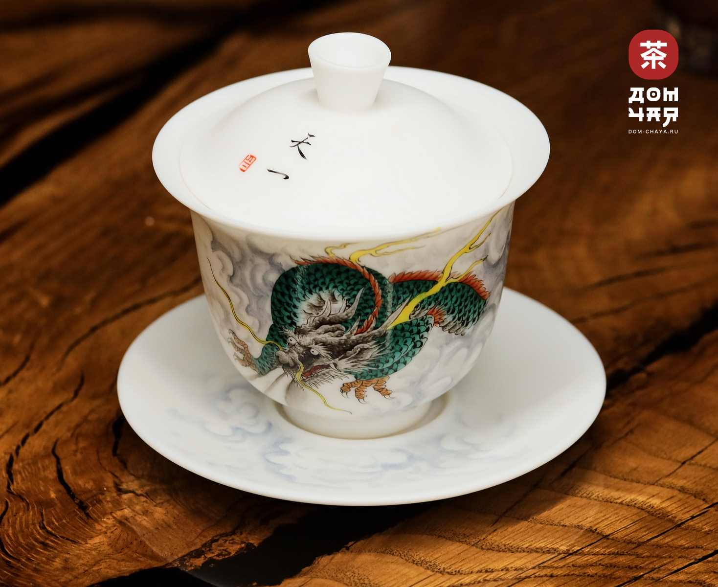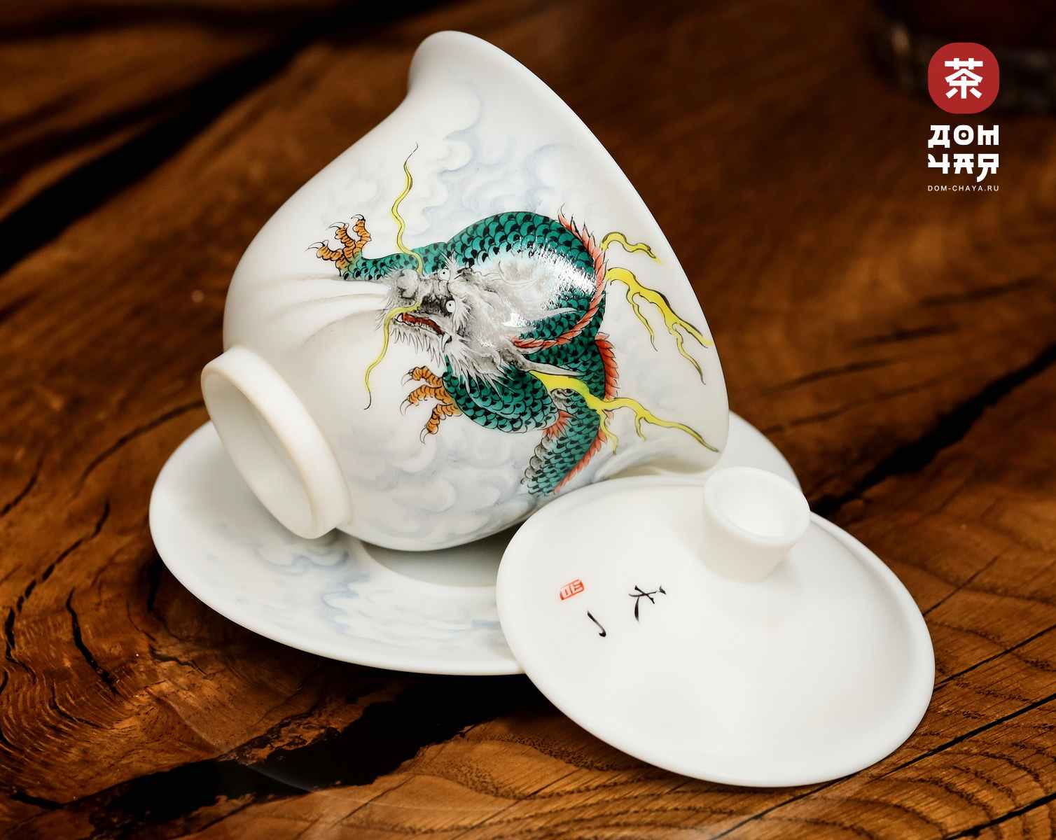 Полностью ручная работа. На крышку, чашу и блюдце вручную нанесён красочный и детализированный рисунок специально под заказ Дом Чая: древнее китайское сказочное существо полудракон-полузверь, пребывающего в своей среде, а также присутствует изящная минималистичная каллиграфия. На широкое блюдце, в котором хорошо помещается чаша гайвани, также продолжается рисунок. Изображение не стирается ни при использовании, ни при мытье. Широкие края гайвани полностью исключают возможность обжигания пальцев , а вытянутая к верху, а не вширь, форма чаши, вместит довольно большой объем чая, при этом оставаясь удобной для хвата.