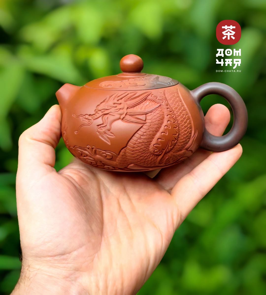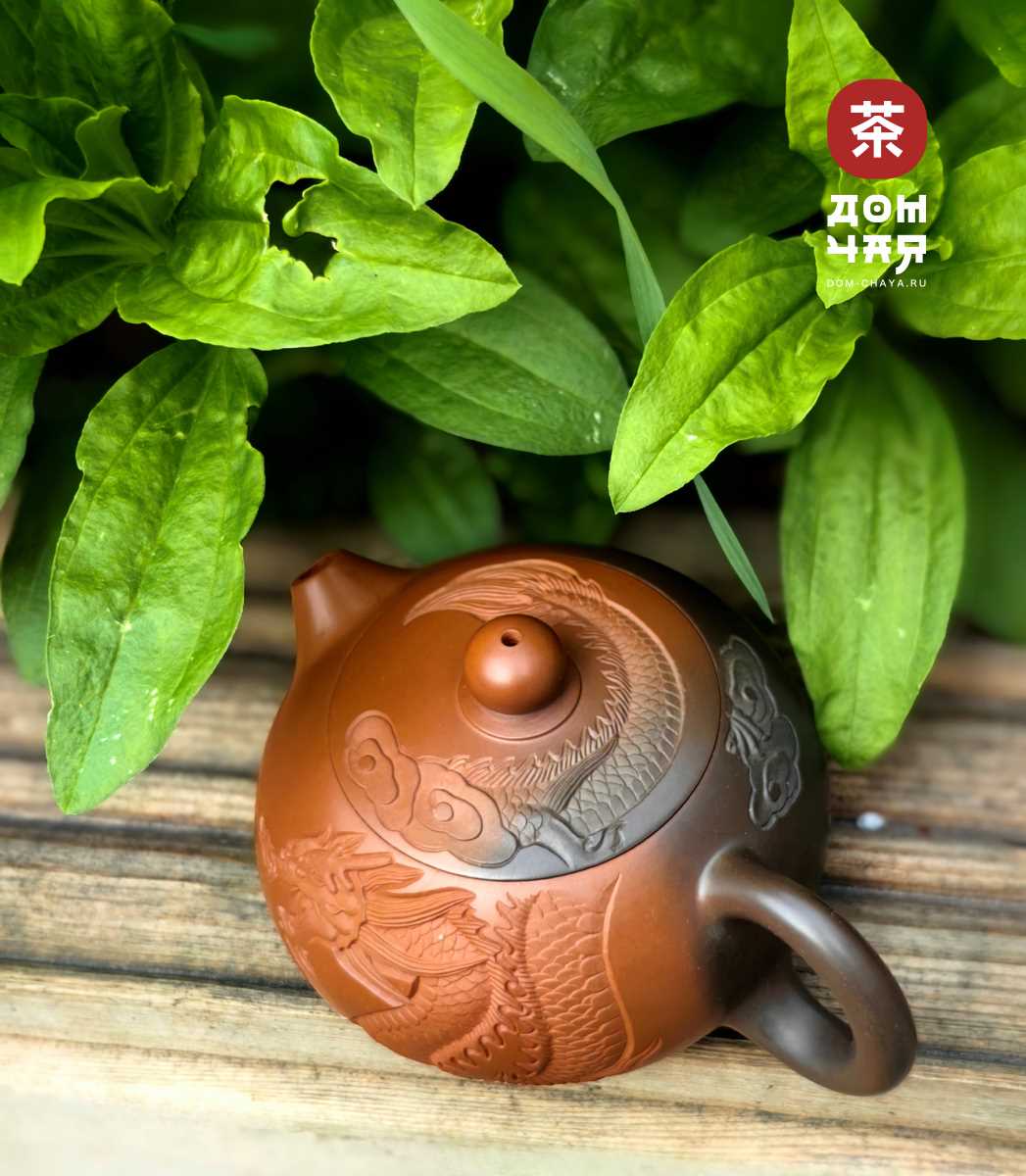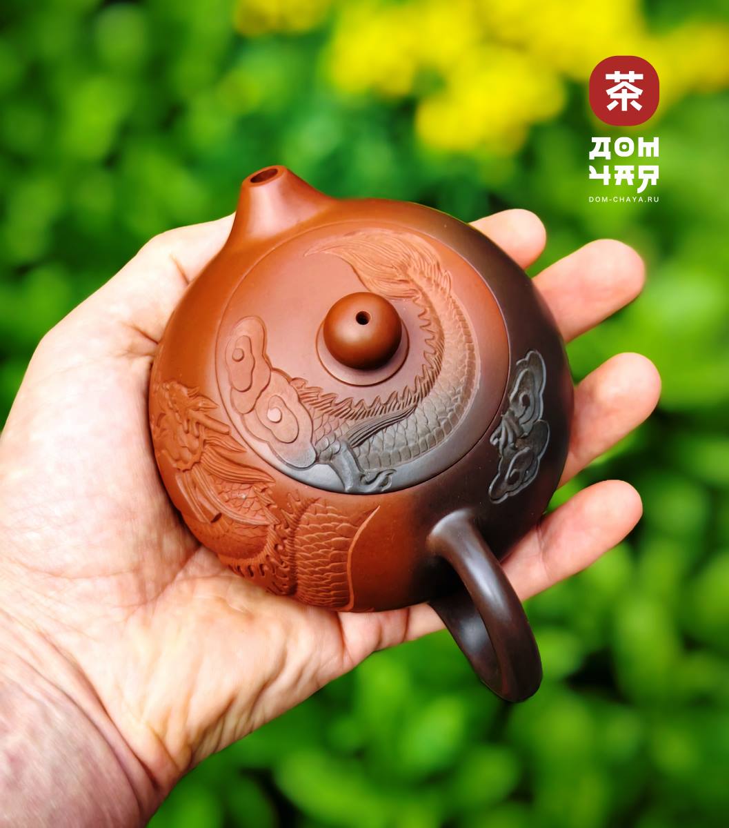 Красивейший чайник от заслуженного мастера Хан Ли, имеющего множество наград на выставках искусств в Гуанси. Чайник представавляет коллекционную ценность, изготовлен полностью вручную, с градиентом черно-красного цвета. Украшен великолепной ручной резьбой с инкрустацией белой глиной, изображающей традиционного китайского дракона. Ловко сидит в руке, изящная ручка. Хорошо притёртая крышка, водный замок работает отлично. Сильный ровный и быстрый слив. По форме хорошо подходит для красных, тёмных улунов, шу пуэра. и хэйча.